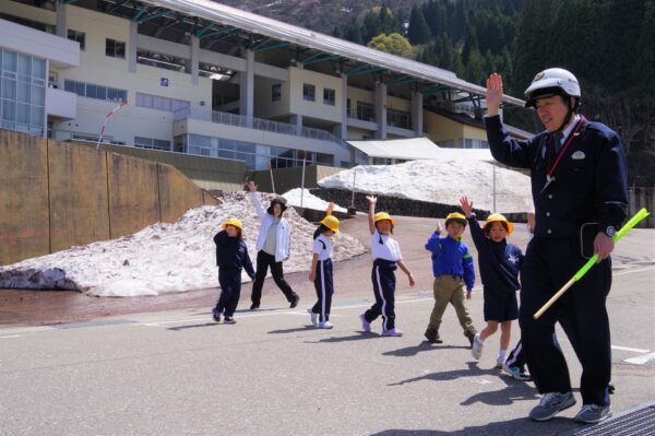 利賀駐在所の巡査長さんを招いて交通安全教室を行いました。1・2年生は、市民センター前の交差点まで歩いて行き、道路の安全な歩き方や信号機のある交差点での横断のしかたを習いました。