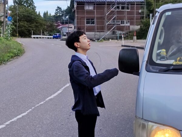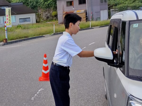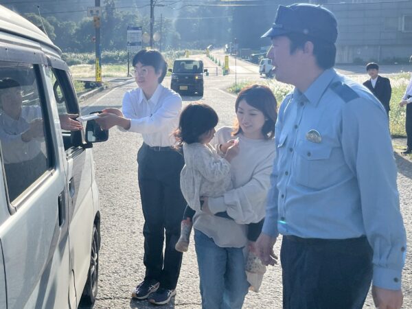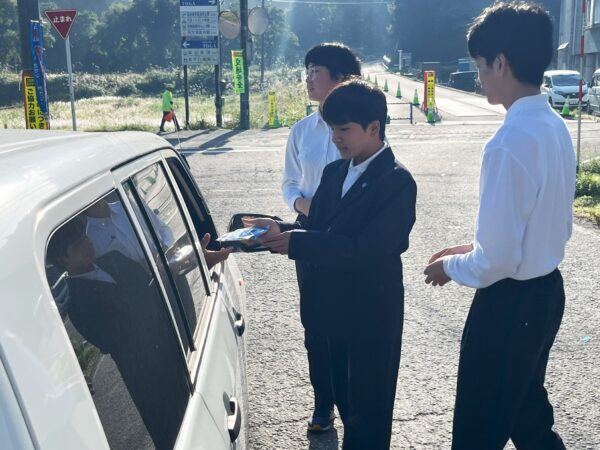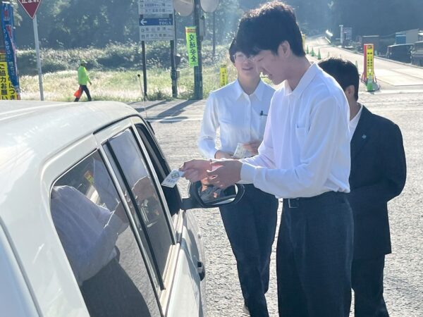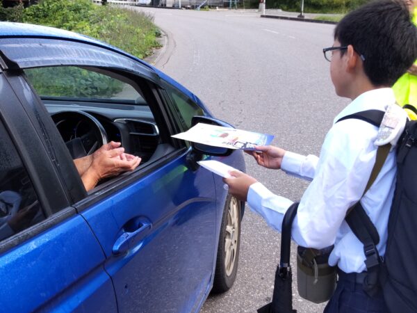 後期課程の生徒が、トチの木広場と百瀬会館前の国道沿いで交通安全の啓発活動に参加しました。自分たちで作ったマスコットと交通安全のリーフレットを配りながら、ドライバーの皆さんに安全運転を呼びかけました。