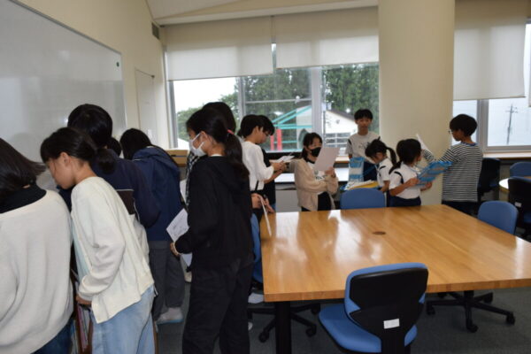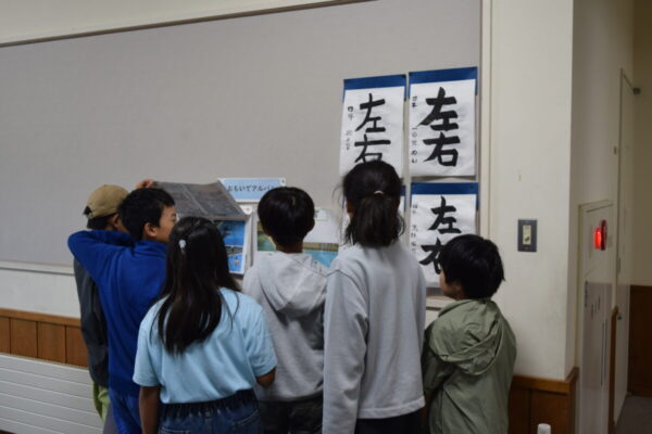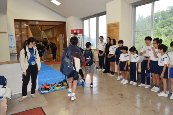 はじめに、利賀学舎の児童が校内をオリエンテーリング形式で案内しました。グループの班長が校舎の見どころを紹介し、初めて訪れる友達に利賀学舎の魅力を伝えることができました。