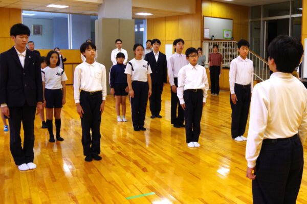 壮行会 10月7日 利賀っ子Diary 2025.10.08 砺波地区新人大会(バドミントン競技)に向けて壮行会を行いました。11日(土)・12日(日)の大会に向けて、代表生徒が力強く決意を語ってくれました。前期課程の児童からは、熱のこもった応援が送られました。校長先生からは、「新人大会は緊張もあるけれど、挑戦する気持ちを大切にして、思い切って試合に臨んでほしい」と、温かいメッセージが送られました。