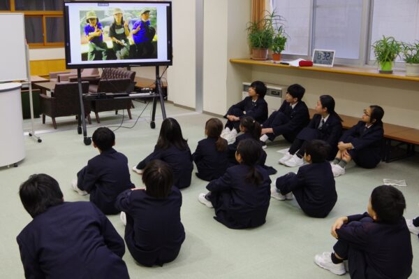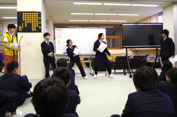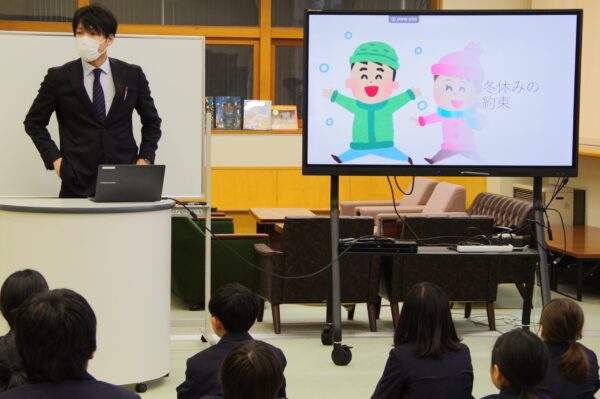 児童生徒集会では、執行委員会が制作したプレゼンテーションを見ながら、2学期の活動を振り返りました。続いて、執行委員会が「利賀仙人」のオリジナル劇を交えながら、冬休みの過ごし方について楽しく伝えてくれました。