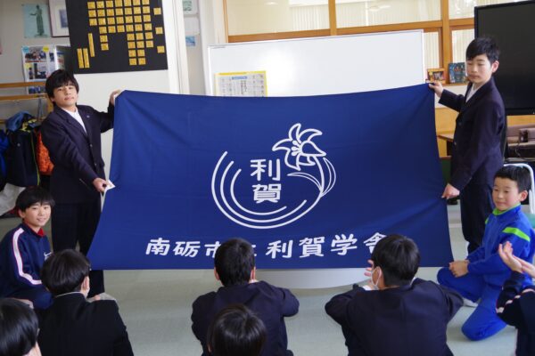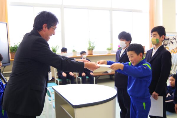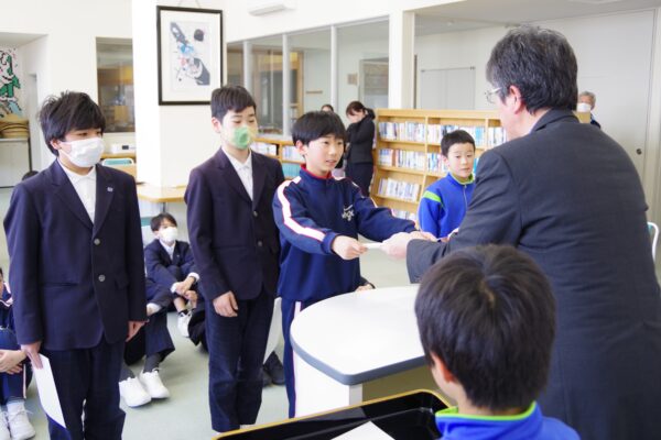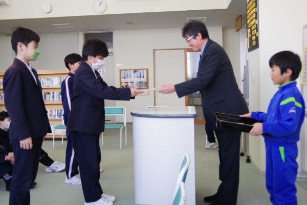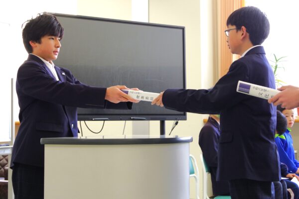 昼休みに、児童生徒会の任命式と引継ぎ式を行いました。任命式では、校長先生から新三役(会長・副会長・執行役員)一人ひとりに任命証が手渡されました。続いて、新会長から文化委員長と健康委員長への委嘱も行われました。その後の引継ぎ式では、生徒会旗が旧役員からから新役員へ託されました。