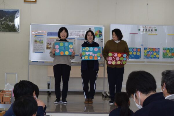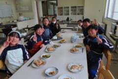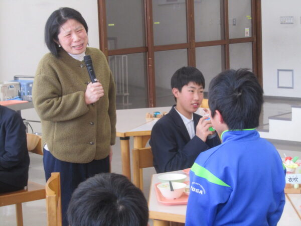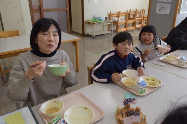 交流会食 2月5日 利賀っ子Diary 2026.02.06 いつもおいしい給食を作ってくださる調理員さんと、献立を考えてくださる栄養教諭の先生をお迎えして、一緒に給食をいただきました。子どもたちはメッセージカードで感謝気持ちを伝えたり、献立づくりや調理についてのお話を聞いたりしながら、楽しい時間を過ごしました。
