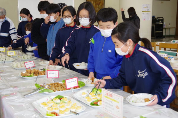バイキング給食では、子どもたちがワクワクしながら料理を選び、笑顔いっぱいの時間になりました。自分で選ぶ楽しさもあり、いつもより食事がぐんとにぎやかになりました。