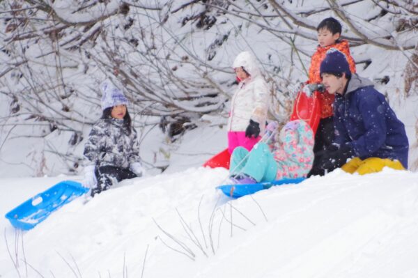 グラウンド横の坂にはふわふわの雪面が広がり、そり遊びにぴった...