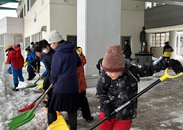 登校後早々に、息つく暇もなく1年生から9年生みんなで雪かきス...