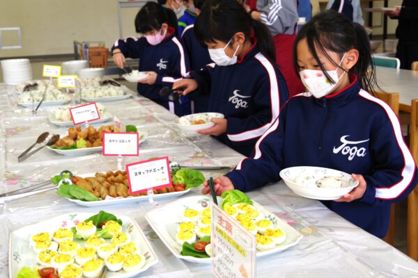 バイキング給食では、子どもたちがワクワクしながら料理を選び、...